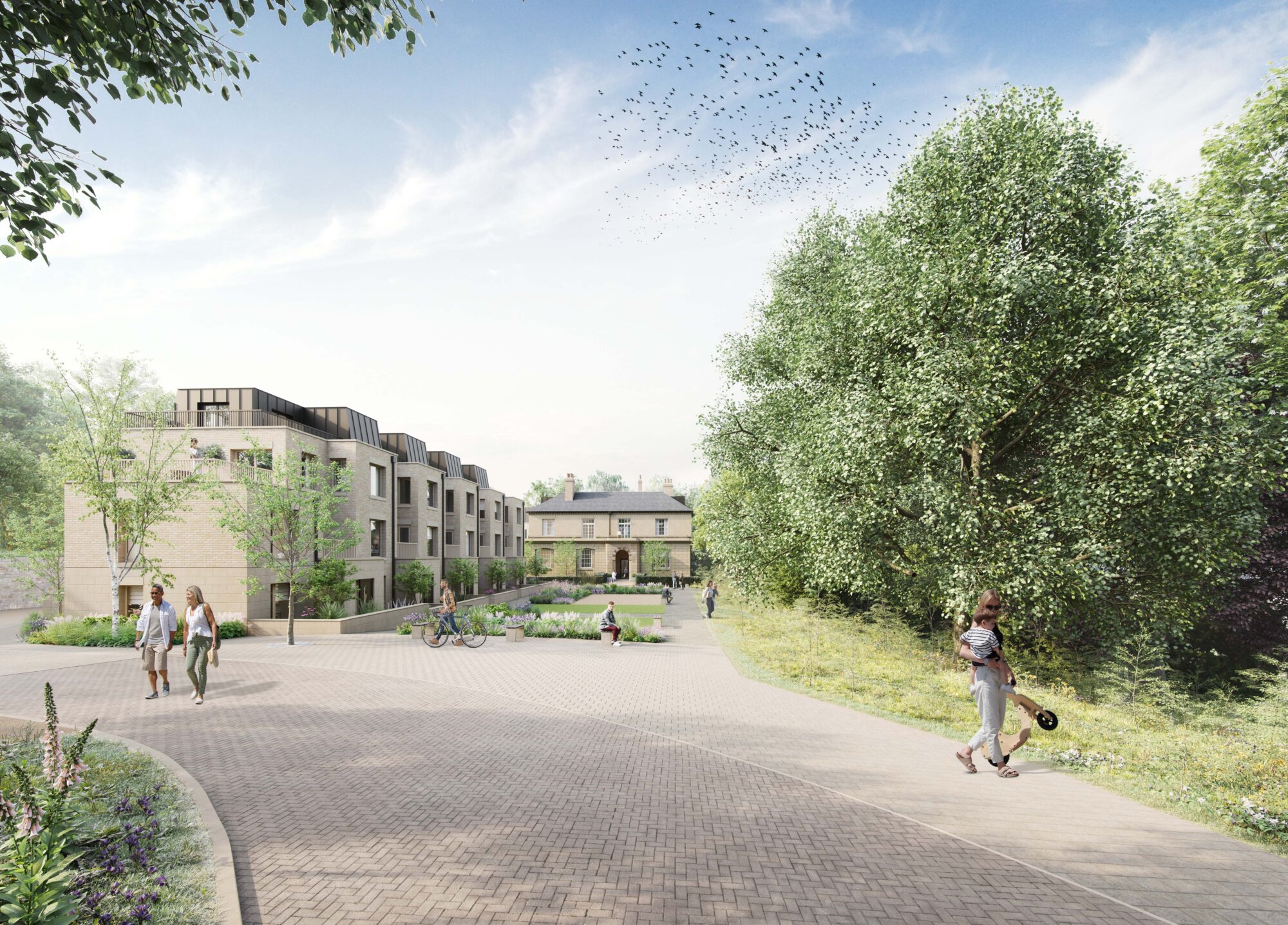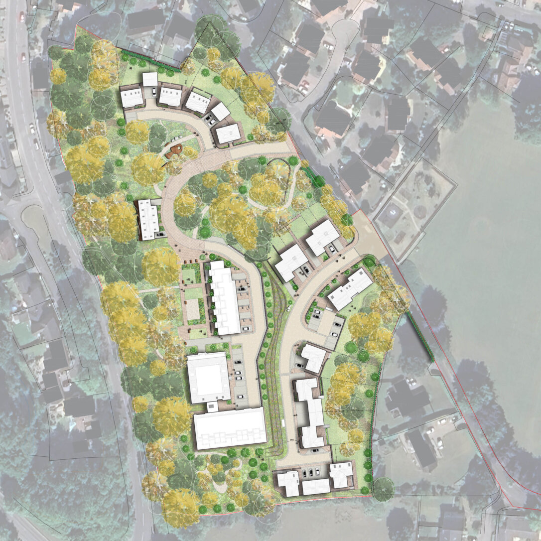 This project is located half way between York and Leeds on the site of a former children’s home in the village of Bramham. A total of 47 homes will be built on the site, introducing a variety of new dwelling types, all set within a extensively landscaped scheme on the grounds of the former Bramham House. Designed in collaboration with landscape architects Re-Form, the site puts greenery, communal spaces and a reconstructed Bramham House at its core. The site is within the allocation for housing in Leeds Unitary Development Plan and Leeds Site Allocations Plan Development Plan.