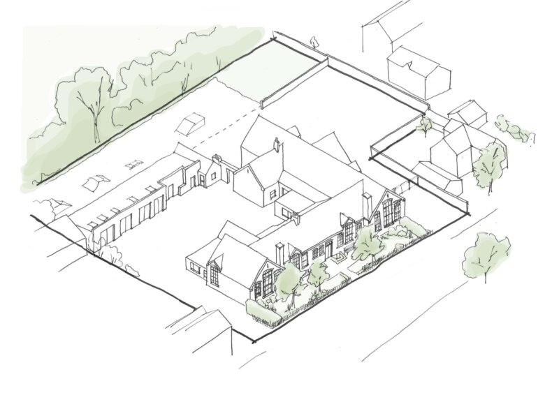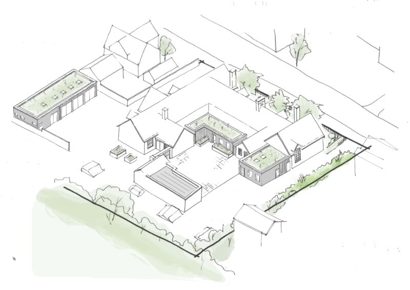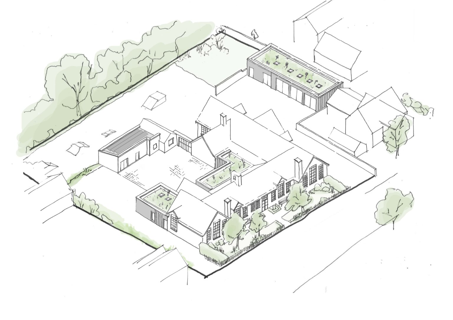 Interventions have been carefully considered in terms of materiality, scale, and form, to be complementary and subservient to the original building. The contemporary appearance of the proposed extensions and outbuildings ensures they remain visually distinct from the original building, whilst green roofs help to soften their impact. Relocating the existing garage will restore views from the principal façade through to the trees beyond, enhancing both the conservation area and the overall streetscape.